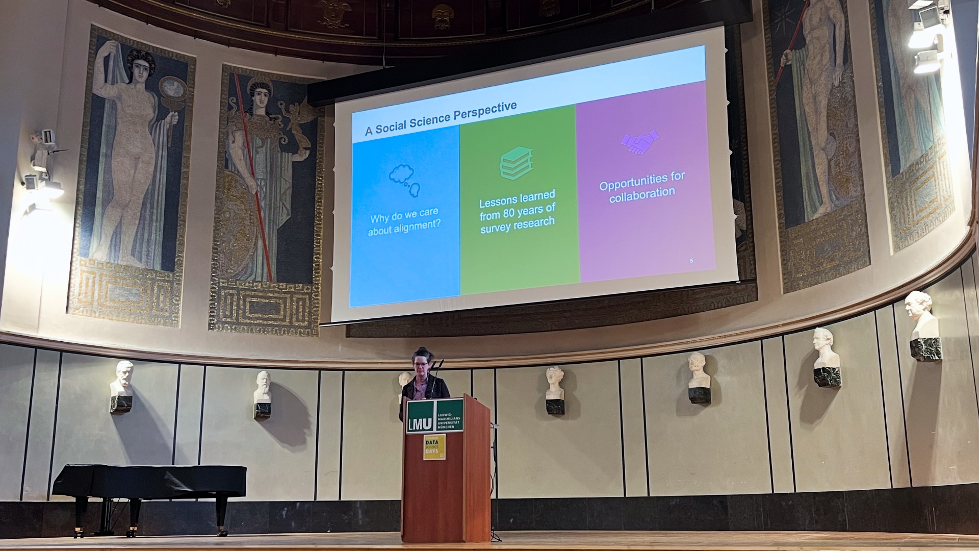 Die letzte Session war der wissenschaftlichen Forschung im Bereich Data Science gewidmet und wurde von drei KollegInnen der LMU sowie der TU München gestaltet. Xiaxiang Zhu präsentierte den aktuellen Stand der Forschung im Bereich der Satellitenbeobachtung, während Wolfgang zu Castell vom Helmholtz-Zentrum für Geoforschung Potsdam und der LMU die Idee eines digitalen Zwillings der Erde aufgriff und deren Anwendung in der Klimaforschung zeigte. Den Abschluss bildete Frauke Kreuter, die Herausforderungen und Probleme bei der Annotation von Daten beschrieb und damit auch die Validität von Large Language Models kritisch beleuchtete.